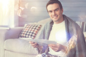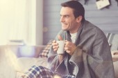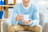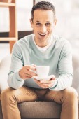 Zachwycony, przystojny mężczyzna, ciesząc się jego herbaty
