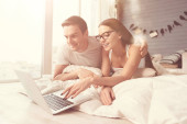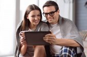 Przyjemne para pozytywny, patrząc na ekran tabletu