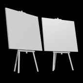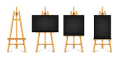 Zestaw czarny drewniane sztalugi z makiety puste puste płótna na białym tle na tle
