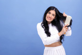 Kobieta z wspaniałe długie włosy, prostowanie w łazience