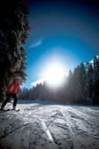 Jazda na nartach, sylwetka narciarzy na stok narciarski z promieniami na niebieskim niebie