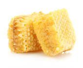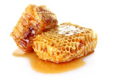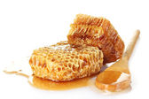 złotych plastrów i drewniane drizzler z miód na białym tle