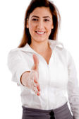 Zdjęcie "wesoły kobieta oferuje uścisk dłoni" może być wykorzystywane do celów osobistych i komercyjnych zgodnie z warunkami zakupionej licencji Royalty-free. Obraz jest dostępny do pobrania w jakości wysokiej rozdzielczości do 5760x3840.