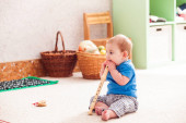 Małe dziecko dziewczynka gra w przedszkolu w klasie przedszkola Montessori. Urocze dziecko w żłobku.
