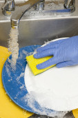 Cleaner kropi detergentu na ściereczki do czyszczenia kuchni. Człowiek, czyszczenie kuchenki gazowe. zbliżenie