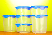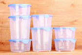 plastikowe pojemniki do żywności na drewnianym stole na zielonym tle