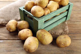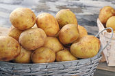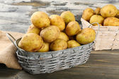 dojrzałe ziemniaki na kosz na drewnianym stole na naturalne tło