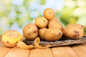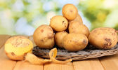 dojrzałe ziemniaki na kołyski wiklinowe na drewnianym stole na naturalne tło