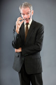szczęśliwy młody biznesmen z krótkimi włosami sobie ciemny garnitur, biała koszula i krawat fioletowy.