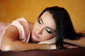 Wspaniała kobieta, leżąc w łóżku z zamkniętymi oczami