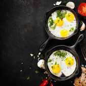 Pan smażone jajka, brokuły i pomidory cherry, widok z góry