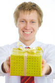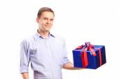 młody człowiek dorywczo gospodarstwa czerwony prezent