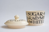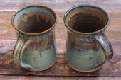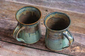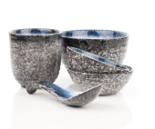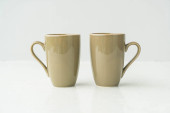 Dwa kubki niebieskie nakrapiane, na białym tle z bliska