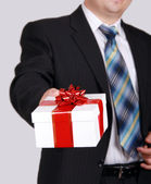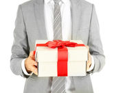 portret młodego biznesmena wręczył pudełko z prezent w ręku