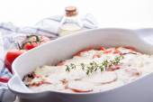 Tradycyjne mięsne gorące gulasz z kwaśnej śmietany i udekorować puree pot