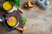 Kobieta ręce trzymając kubek Zupa jarzynowa z pietruszka i grzankami na podłoże drewniane - wegetariańska zdrowy zima