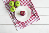 Jabłka w miskach z widelcem i serwetki na stół rustykalne drewniane