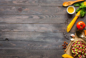 Tło makaron. Kilka rodzajów suchy makaron z warzywami, i