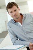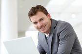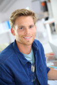 uśmiechający się przystojny facet stoi na korytarzu