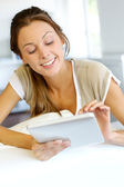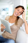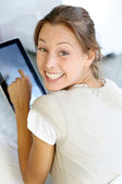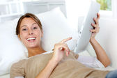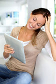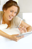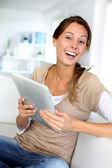 młoda kobieta za pomocą elektronicznego tabletki siedzi na kanapie