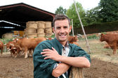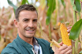 Portret uśmiechniętego rolnika trzymającego koszyk warzyw