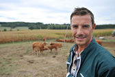 wesoły rolnik stałego przez silo kukurydzy