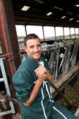 rolnik stojący przed stada krów z butelki mleka