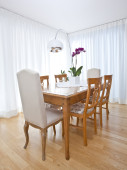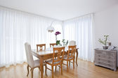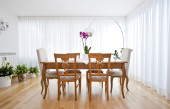 Zdjęcie "nowoczesnej jadalni z białe zasłony" może być wykorzystywane do celów osobistych i komercyjnych zgodnie z warunkami zakupionej licencji Royalty-free. Obraz jest dostępny do pobrania w jakości wysokiej rozdzielczości do 5760x3840.