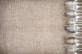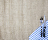 Obrus z tkaniny lnianej szorstki z widelcem i nożem. Creative tło dla menu lub transparent kawiarni lub restauracji.