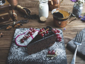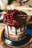 Kobieta jedzenie ciasto czekoladowe z jagody czerwone porzeczki
