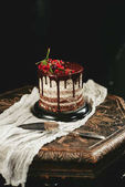 Kobieta jedzenie ciasto czekoladowe z jagody czerwone porzeczki