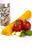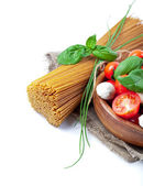 włoski makaron z warzywami w drewniane płyty na białym tle