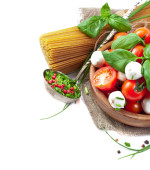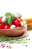 włoski makaron z warzywami w drewniane płyty na białym tle