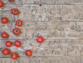 Wiśniowe pomidory w misce szkła na stół rustykalne.