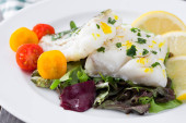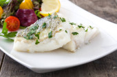 Smażony filet z dorsza i sałatka w płycie na podłoże drewniane