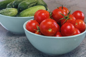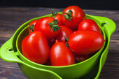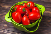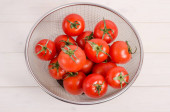 Świeże pomidory cherry zielony durszlak na białym malowane woo