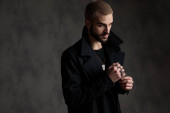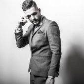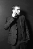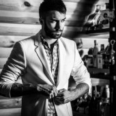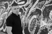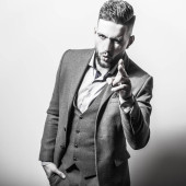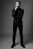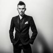 Elegancki, młody człowiek w fryzjera. Fotografia czarno biała.