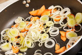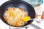 Smażona cebula i marchewka na patelni. Widok z góry