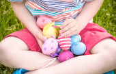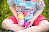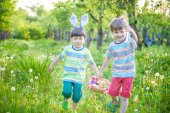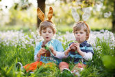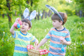 Dwóch małych chłopców i przyjaciół w wielkanocnych uszach króliczka podczas tradycyjnego polowania na jajka w wiosennym ogrodzie, na świeżym powietrzu. Rodzeństwo bawi się ze znalezieniem kolorowych jaj. Stara chrześcijańska tradycja katolicka