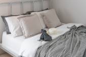 Szalik i biały kapelusz ustawienie na pasek koc z poduszkami pastelowych kolorów
