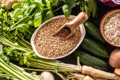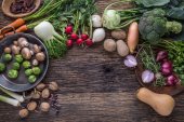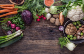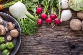 Ręka krojenia warzyw. Ręce kobiety jest cięcie grzyby na desce w pobliżu warzyw.