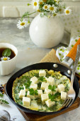 Zdjęcie "Tło śniadanie. Kodowany mish-mash z papryka, pomidory" może być wykorzystywane do celów osobistych i komercyjnych zgodnie z warunkami zakupionej licencji Royalty-free. Obraz jest dostępny do pobrania w jakości wysokiej rozdzielczości do 5760x3840.