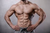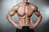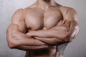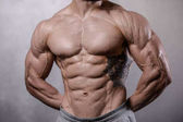 Man brutalnie silny kulturysta stwarzających w studio na szarym tle