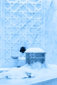 Dzban wody, ręcznik i miedzi miska z mydła pianki w Turcji hamam