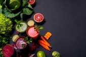 Diety detoks. Zdrowe odżywianie. Różne kolorowe świeże soki, warzywa i owoce