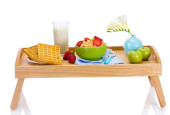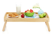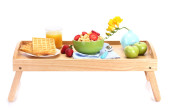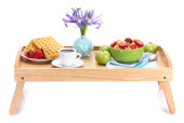 lekkie śniadanie na drewnianej tacy na białym tle