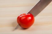 Cięcie pomidorów do potraw na stół. Warzywa podczas gotowania potraw procesu. Warzywa dla zdrowego odżywiania i diety