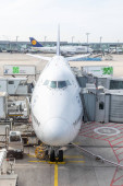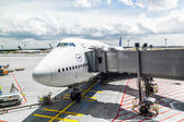 samolotem Lufthansy 747 zaparkowany na lotnisko we Frankfurcie podczas