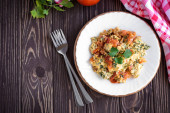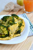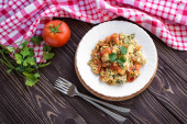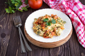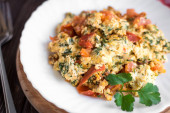 Jajka smażone z pomidorami na ciemny drewniany stół