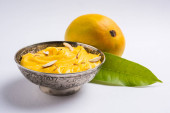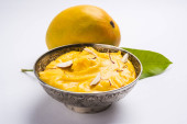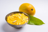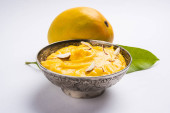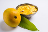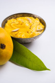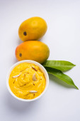 hapus lub alphonso pudding Mango / Mango shrikhand lub srikhand lub amrakhand - z Mango na deser z magoes mleko skondensowane i orzechy, Selektywny fokus na białe tło